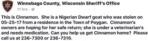 Winnebago County Sheriff’s Office is now in search of the answer after the Nigerian Dwarf goat was stolen from the Town of Poygan, which has a very small population of just over a 1000 people, with 397 households, and 308 families, according to the census figures available.