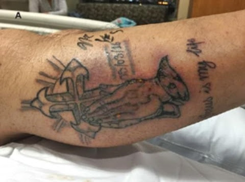 His fresh wound became infected with flesh-eating bacteria and he developed a fever and serious rash surrounding his tattoo.